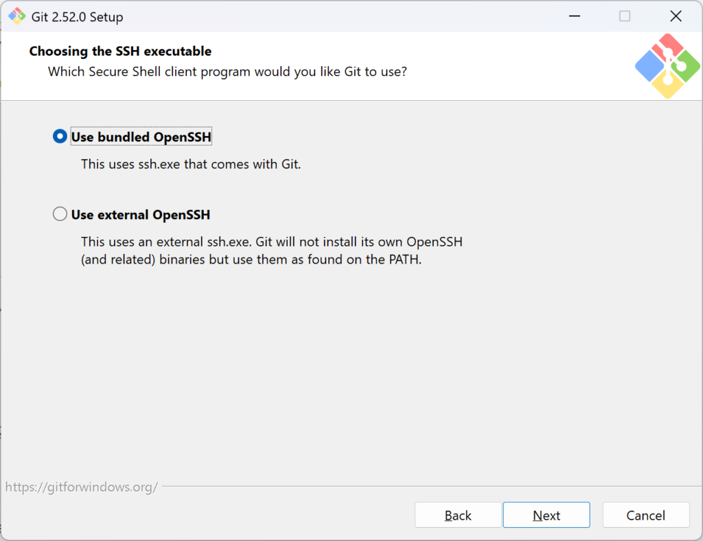 Use external OpenSSHのほうは、独自にSSHの設定をしないといけないようなので、問題外。