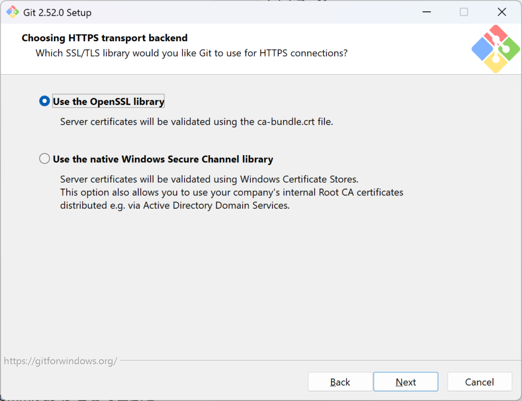 Windowsの証明書ストアを使用するということで、これまたよくわからにので、バンドルされてるやつ。