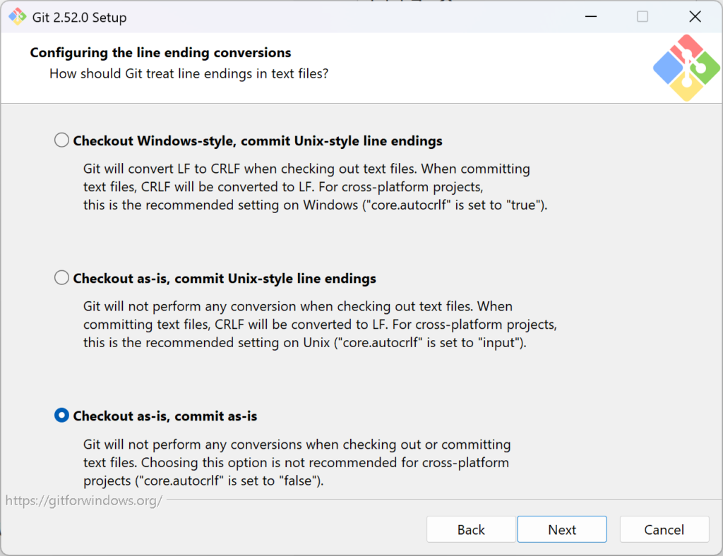 - チェックアウト時:LF → CRLF に変換(Windows用)