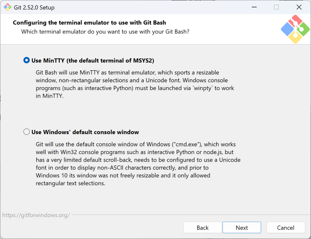 続いて、GitBashを使うときのターミナルの選択。