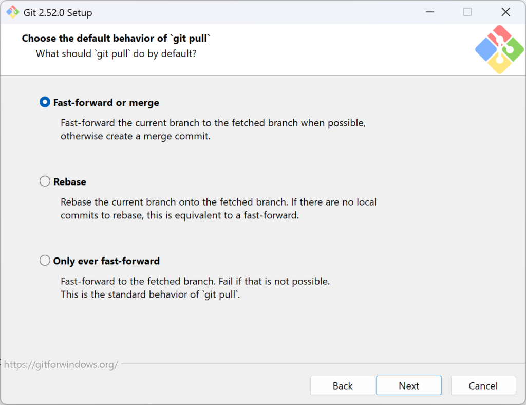 2番目を選ぶのがよさそうな気もするけど、結局Fast forwardとリベースがなんなのかわかってないので、とりあえず1番目を選択。