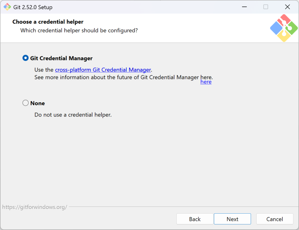次は認証情報をどうするかで、Noneにすると、プッシュやプルのときにいちいち認証情報を入力しないといけないらしいので、前者一択。
